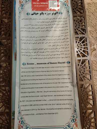 Read moreمدرسه حیاتی مربوط به اواخر دوره قاجار است و در کرمان، مسیر بازار بزرگ، محدوده بازار وکیل واقع شده و این اثر در تاریخ ۱۰ مهر ۱۳۸۰ با شمارهٔ ثبت ۴۱۸۰ بهعنوان یکی از آثار ملی ایران به ثبت رسیده است. این بنای تاریخی در سال ۱۲۶۷ هجری شمسی به عنوان بانک شاهنشاهی ایران و انگلیس ساخته شد. پس از تعطیلی بانک و انتقال آن به محل کنسولگری انگلیس، ساختمان حیاتی در سال ۱۳۱۲ برای استفاده دانشآموزان بازسازی و سال ۱۳۲۰ به احترام بانو "بی بی حیاتی" به نام او نامگذاری شد این مدرسه تا سال ۱۳۵۶ به همین منظور استفاده میشد. پس از آن به مدت ۳۷ سال متروک و بلا استفاده شد. تا اینکه در پاییز سال ۱۳۸۵ به شماره ۴۱۸۰ به ثبت رسید و در سال ۹۳ با دستور استاندارد وقت با هدف تغییر کاربری به موزه، مرمت و در زمستان ۱۳۹۴ توسط شهرداری کرمان به نام اکونو موزه بانو حیاتی افتتاح شد و اکنون به عنوان موزه مشاغل و حرف کرمان قدیم فعالیت می کند.