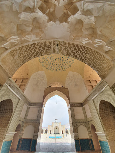 In the past, there was an aqueduct called Mastoureh (named after the daughter of Malek Touran Shah I) whose water would pass through this mosque. The great porch of mosque Qibla is in front of the eastern entrance. A gate opens to the north and another gate opens to the south-west. There is a waterfront in the middle of mosque scene which is four meters deep. There is a great porch in the western side of it with colorful...