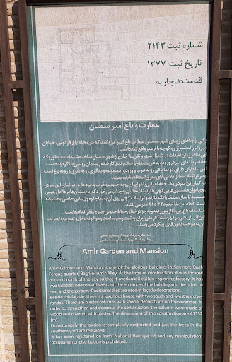 Read moreخانهباغ امیر در بلوار میرزا بزرگ شیرازی(باغ فردوس) سمنان واقع شده و متعلق به خاندان فامیلی است. این بنا به دستور حاج میرزاآقا فامیلی و توسط استاد معمارباشی، در دوران قاجار احداث شده است. علت نامگذاری این عمارت به دلیل همجواری با باغ امیر اعظم، مشهورترین حاکم ایالت قومس(استان سمنان فعلی،) بوده است؛ که در سال ۱۲۹۵هجری شمسی به ضرب گلوله کشته شد. فرهادخان قاجار و بعدتر امیرخان سردار(حاکم خور و سمنان) مالک خانهباغ بودهاند. امروز مالکیت آن در اختیار شهرداری سمنان است و بخشی از مالکیت بنای سردر در اختیار آقای هرمز فامیلی میباشد. قسمت باغ این بنا نیز تفکیک شده و مالک خصوصی دارد. این اثر در تاریخ ۹ آبان ۱۳۷۷ با شماره ثبت ۲۱۴۳ بهعنوان یکی از آثار ملی ایران به ثبت رسیده است. عمارت امیر برگرفته از معماری صفوی است و مساحت زمین آن ۱۴۸۰ مترمربع و مموع زیربنای آن ۳۷۰ مترمربع میباشد. این بنا تقریباً در زمان ساخت خارج از شهر سمنان ساخته شده است بطوری که خانه بر بلندای سردر ورودی باغی مصفا با درختان تنومند و چنارهای بزرگ، انجیرستان، توتستان و زمینهای زراعی و با چشمانداز کارخانه ریسمانریسی بنا شدهبود. این بنا دارای دو نما یکی رو به غرب(ورودی مجموعه) و دیگری رو به شرق و رو به باغ است. در تزئینات نما از کاشی هفترنگ استفاده شده و در کنار این سردر، یک خانه اعیانی با دو ایوان رو به جنوب و غرب وجود دارد. آب این خانهباغ از محل قنات ضیائیه که به استخر امیریه(امیر)، میریخت؛ تأمین میشد. بخشهای داخلی بنا از نظر فرهنگی به سه دسته فضای عمومی، خصوصی، نیمهخصوصی تقسیم میشود. ساختمان سردر دارای دو اشکوب همکف و اول و بنای خانه شامل دو اشکوب زیرزمین و همکف میباشد. در نمای این بنا و در روی ایوانها، ستونهایی گچی با تزئینات جالبی به چشم میخورد که این ستونها در داخل چوبی هستند تا سازه سقف را نگه دارند و تزئینات گچی روی آن به نما جلوه و زیبائی خاصی بخشیده است. عمده ساختمایه این بنا آجر، خشت، گچ و چوب است. از ویژگیها و تزئینات این بنا میتوان به سرستونهای کرنتی، هرهچینی بالای طاقنماها، آرایههای گچی بالای دیوار اتاقها، هورنوهای داخل اتاقها و گرهچینیهای چوبی سقف و … اشاره کرد. از این بنا هماکنون به عنوان موزه ۱۰۰ ساله سمنان و تحت اسم «باغموزه امیر»...