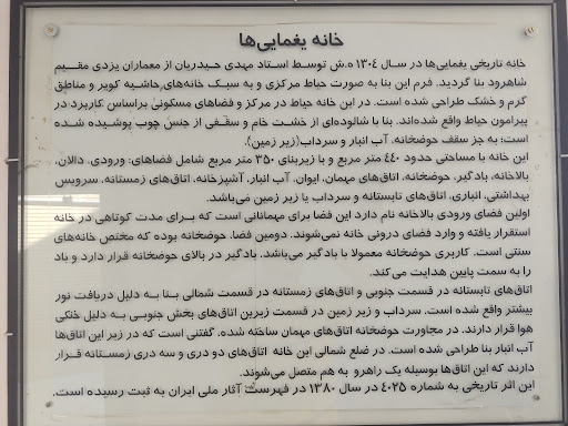 خانه یغمایی‌های شاهرود که در اختیار اداره میراث فرهنگی و گردشگری قرار دارد، نمونه‌ای است از معماری سنتی ایران با استفاده از بادگیر. این خانه احتمالاً به عنوان یک آثار تاریخی و فرهنگی شناخته شده است که از نقش بادگیر به عنوان یکی از ویژگی‌های مهم معماری خود بهره می‌برد. 1. **بادگیر به عنوان ابزار مهم معماری:** استفاده از بادگیر در ساختمان‌ها، نشان از دانش معماری محلی و تلاش برای بهینه‌سازی شرایط زندگی در طول سال دارد. بادگیرها به خنک کردن فضا در تابستان و گرم نگه داشتن در زمستان کمک می‌کنند. 2. **حفاظت و نگهداری تاریخی:** اختیار این خانه توسط اداره میراث فرهنگی و گردشگری نشان از توجه به حفاظت از میراث تاریخی و فرهنگی دارد. این اقدام به نگهداری و ارتقاء این ساختمان به عنوان یک نماد ارزشمند تاریخی کمک کرده است. 3. **گردشگری فرهنگی:** مسئولیت اداره میراث فرهنگی و گردشگری شاهرود در اختیار این خانه، می‌تواند به ترویج گردشگری فرهنگی در منطقه کمک کند. با آشنایی با معماری سنتی و استفاده از بادگیر، بازدیدکنندگان به تاریخ و فرهنگ این ناحیه نزدیک‌تر می‌شوند. در مجموع، خانه یغمایی‌های شاهرود به عنوان یک مثال از ادغام بادگیر در معماری سنتی ایرانی، نقش مهمی در حفظ تاریخ و فرهنگ منطقه ایفا می‌کند و به توسعه گردشگری فرهنگی در این منطقه کمک می‌کند.