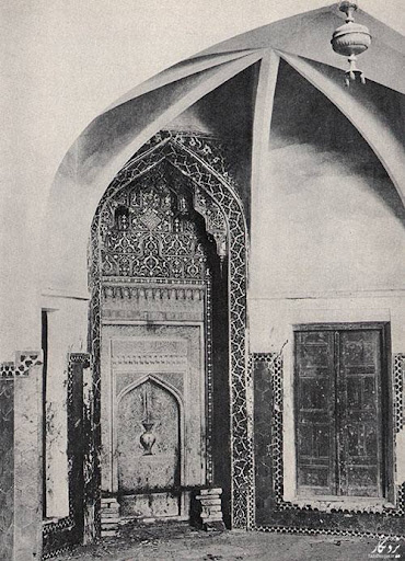 محراب صحنه اصلی از کاشی معرق است با ساختمانی مقرنس کاری که در وسط آن سنگ مرمر بسیار خوشتراشی به اندازه ۱/۱۵ * ۳/۳۸ متر نصب شدهاست و در وسط مقرنس کاری یک گل مربع به اندازه ۵۴ * ۹۵ سانتیمتر نصب است و در دست چپ آن، یک سنگ مرمر به اندازه ۲۸ * ۳۰ سانتیمتر نصب شدهاست. سر در شرقی مسجد دارای کتیبههایی از کاشی معرق به خط ثلث...