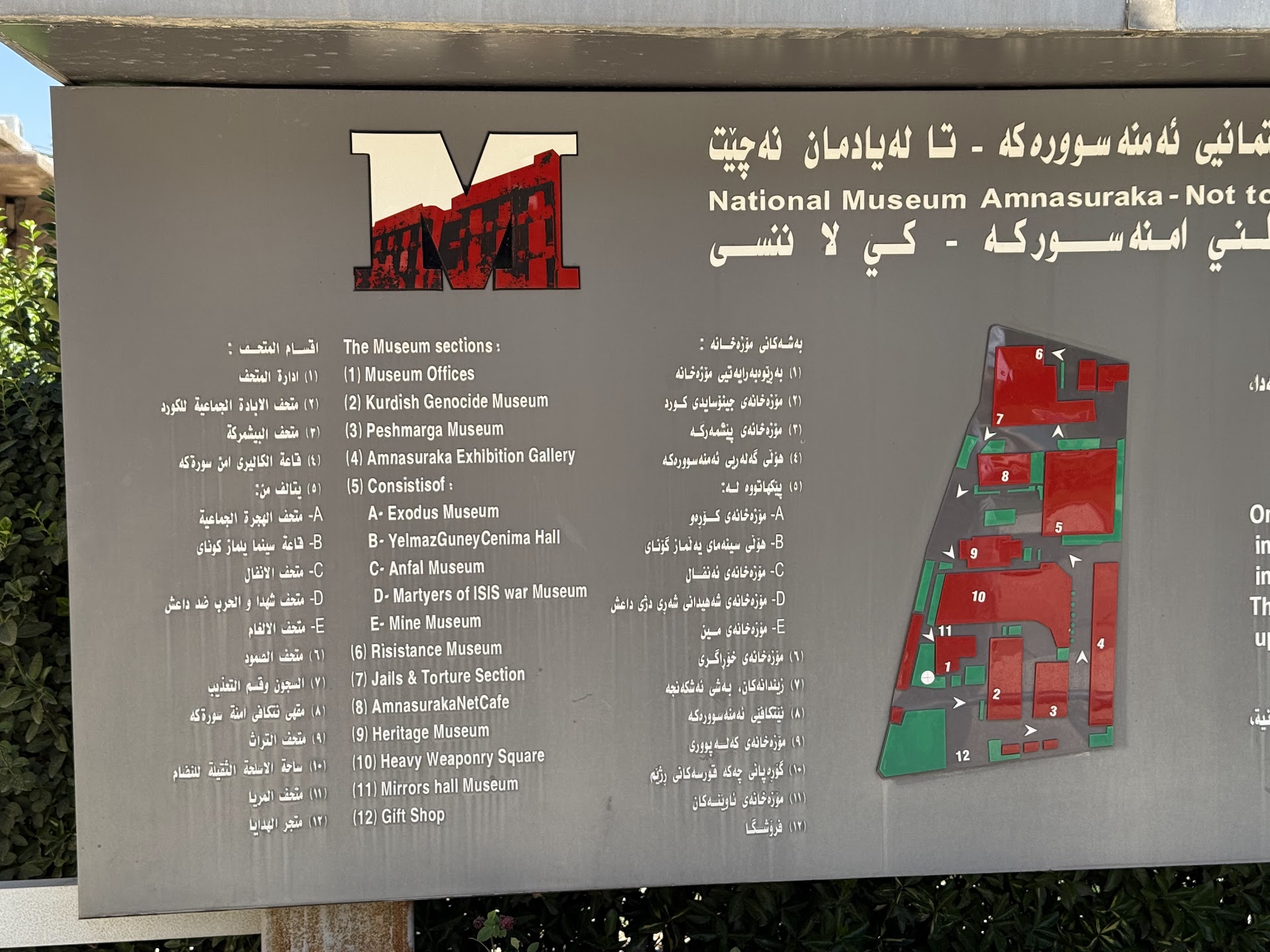 Today, Amna Suraka serves as a museum and memorial dedicated to documenting the atrocities committed under Saddam Hussein's rule, particularly during the Anfal campaign against the Kurds in the 1980s. The site includes preserved prison cells, torture chambers, and an exhibition of personal belongings, photographs, and documents of victims.