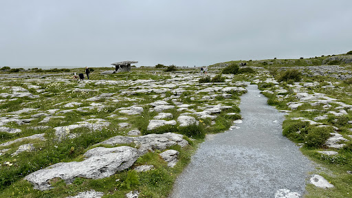 The dolmen itself is one of the most iconic monuments in the Burren. It’s a Neolithic portal tomb, built over 5,000 years ago, and excavations revealed the remains of more than 30 people buried here, along with artifacts like pottery and stone tools. Standing in front of it, with its massive capstone balanced on upright stones, you really feel the weight of history against the stark limestone landscape.