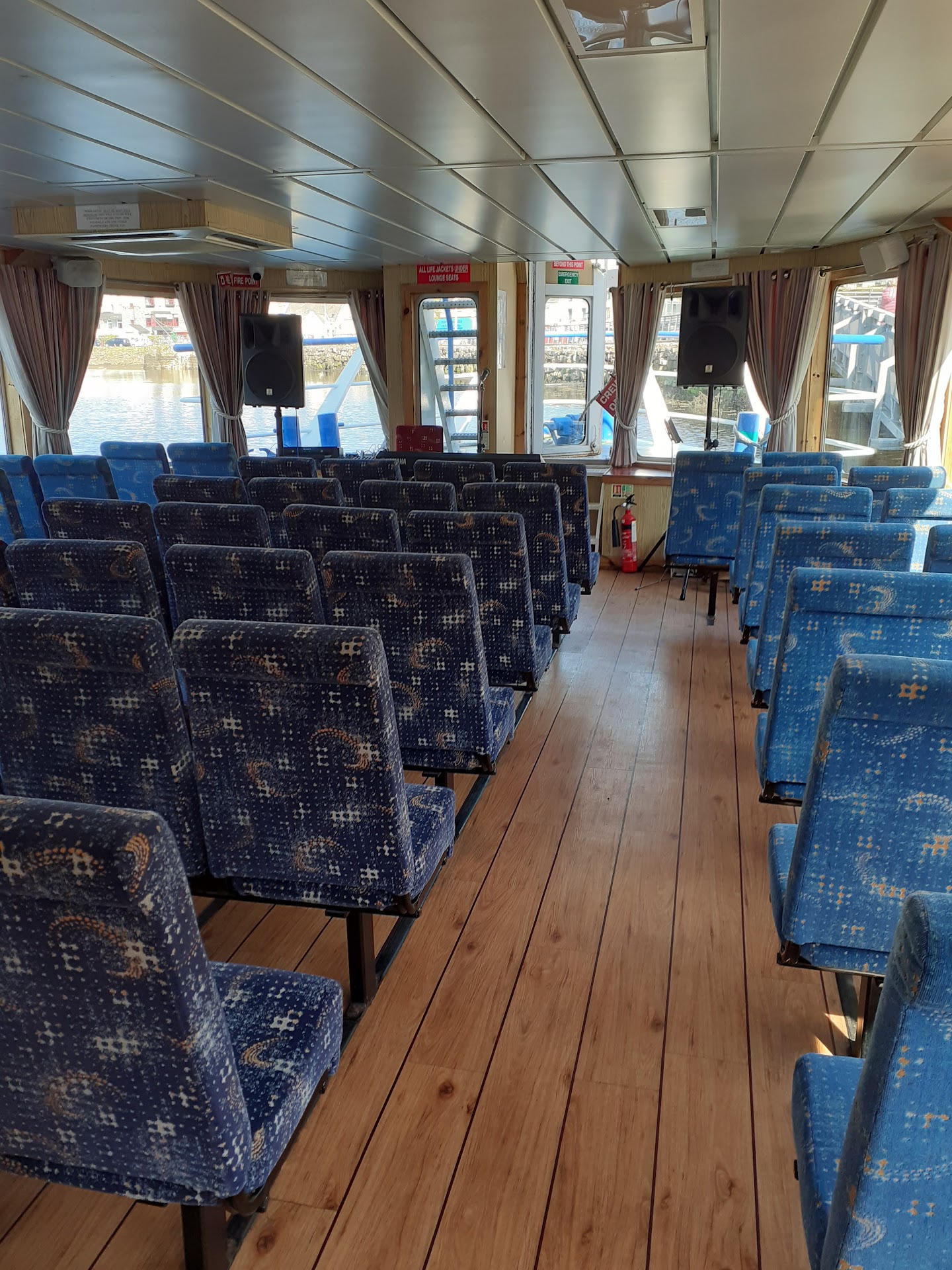 Word to the wise, queue starts 30 mins prior to departure - if there are some bus tours and they are booked on - best be at the gangway gate 30 mins prior to sailing to get seats for your party - the seats are lounge type inside and single fold down/up, & rows of 2 on the upper deck.