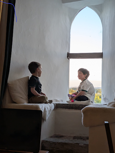 It was the first visit for my grandchildren. They loved everything about the historic building, from the landscaped garden to the medieval Norman knights depicted on the white walls of the great hall. Sitting on the cushions lining the high Norman “arrow slit” windows set in the thick stone walls, and looking out over the lake, they chatted for hours. Occasionally, they paused to chase each other around the child-friendly great hall and up and down the deep stone stairs to the lower bedrooms. Rooms, the walls of which, in keeping with the castle owner’s dedication to authenticity, look exactly as they would have done 700 years ago. But now with heating and modern bedding and with a bathroom next door.