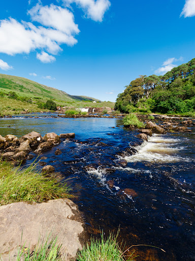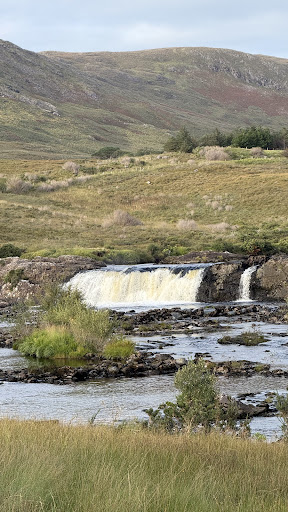 Absolutely gorgeous place. We were lucky enough to visit it on a gorgeous sunny afternoon. The shimmering light on it blue waters made it even more wonderful. It has a small car park around a tight bend, can accommodate 10-12 vehicles, so can get crowded pretty quickly. Alternatively one can park across the bridge towards Leenane (there is a bigger car park) and then walk up here (will be quite a walk).. The entrance to the fall is shrouded behind bushes and one has to stop and look to find it or just follow the crowd.. The walk till the fall is not straightforward, requires one to navigate through rocks and boggy, wet grasses, not is not tricky and can be easily done. Near the fall one can sit on the big rocks lying there strategically to give you the best view of the fall or you can climb up further to the tip of the fall via a narrow path towards the left of fall. It will bring you at the top of the fall and you will be greeted with even better view of gorgeous valley and the surroundings mountains.. No cafe or public amenities here.. if you need one the nearest is the Leenane...