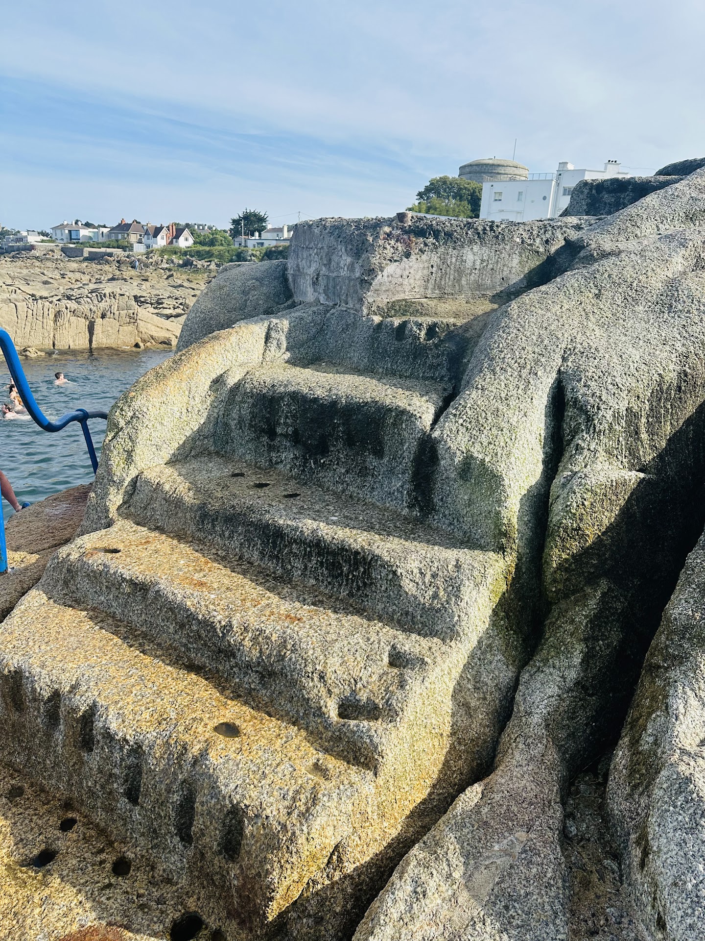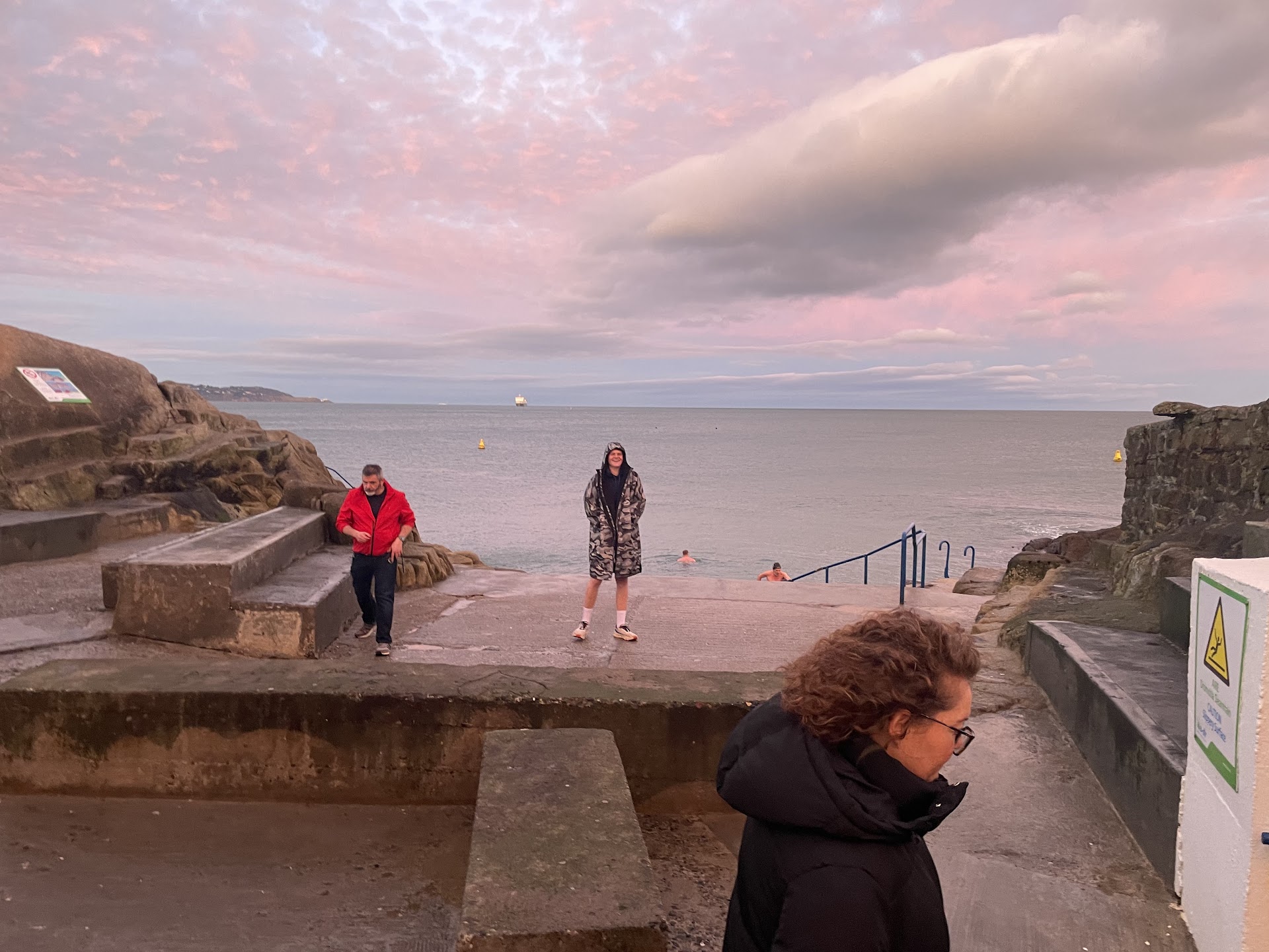 I would say pls do not go down or up those steps if the swell is big, & especially if you are not used to open sea conditions. Today, the conditions were actually dangerous, & I only felt the power & danger of the sea on my second going up the steps. I was doing the sauna & cold water immersion lark. On trying to get out after dip #2, the waves were fiercely pulling my grip off the handrail. I got thrown against it, and my thigh muscle got a lashing. The waves also crashed over my head, so I was submerged for a few seconds. I had to hold on to the handrail for dear life to be able to get out after all that. I swim open sea races for the last 3 summers in Ireland, & have experienced strong swells at times. But this was something else. I will never risk going down & up those steps again with the sea being strong like it was today. The getting in was relatively easy, the getting back to the rail & out without being pulverised by the waves was very very hard. Pls don't risk your life or anybody else's by getting in when the swell is strong. Don't think that you can match the sea in strength... We honestly can't. Better safe than sorry... If in doubt, ask other swimmers /dippers there who might be more experienced. Loving @fad saoil sauna at the Forty...