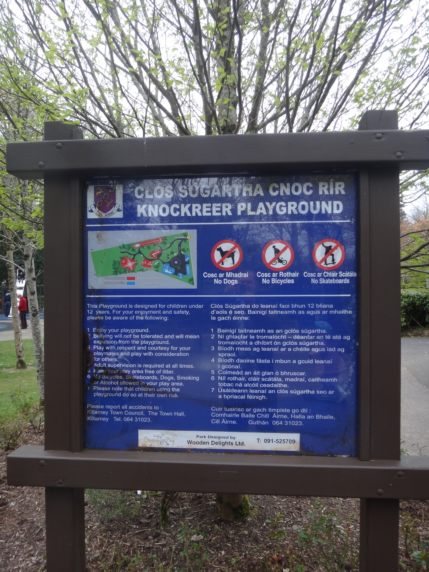 Big extensive playground in a beautiful setting at the edge of Killarney National Park. Has lots of different features for all age groups, including a dedicated toddler area. It can be full at times, especially during the week when the nearby primary (and secondary!) schools are finished for the day and pupils pop in to hang out for a while on their way home. Well maintained, but closes (too) early especially in the summer (7 pm when often it'd be a bright and lovely evening until 10 or later). It has a cool wooden train for kids to climb and play on (which could do with a bit of sanding down and a new coat of paint to prevent splinters in the smallies, by the way, as it looks pretty...