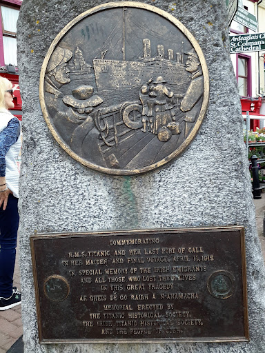 The upper, circular plaque, carries a bas-relief scene depicting emigrants aboard a tender approaching the port-side of the Titanic's bow. In the foreground there' a male and female couple to the left and a single male to the right. In the scene's centre, there's a mother and three children with their backs towards us and with their baggage at their feet. The mother has her right arm across one of the smaller child's right shoulder. A second child has their right arm around the mother's waist, and the third and tallest child has his left hand up pointing at the ship. In the scene's background the Titanic is shown anchored in the harbour. They are all looking towards the Titanic. The lower, rectangular plaque, is inscribed with words commemorating the Titanic and her last port of call on her maiden and final voyage on 12 April, 1912 and in special memory to the Irish emigrants and all those passengers and crew who lost their lives in the Titanic tragedy. Below this is a Gaelic inscription, Ah dheis dé go raibh an anmacha, which translates as "At God's right hand are the souls".