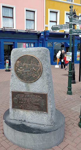 As Cobh, formerly Queenstown, was the last port of call of the RMS Titanic before she set sale to New York, the town has many memorials dedicated to the tragedy. This memorial, dedicated to the passengers of Titanic is located in the centre of town, at the corner of Pearse Square and West Beach. It's in the form of two plaques attached to the face of a large rectangular rough hewn granite slab which sits atop a cylindrical pedestal base.