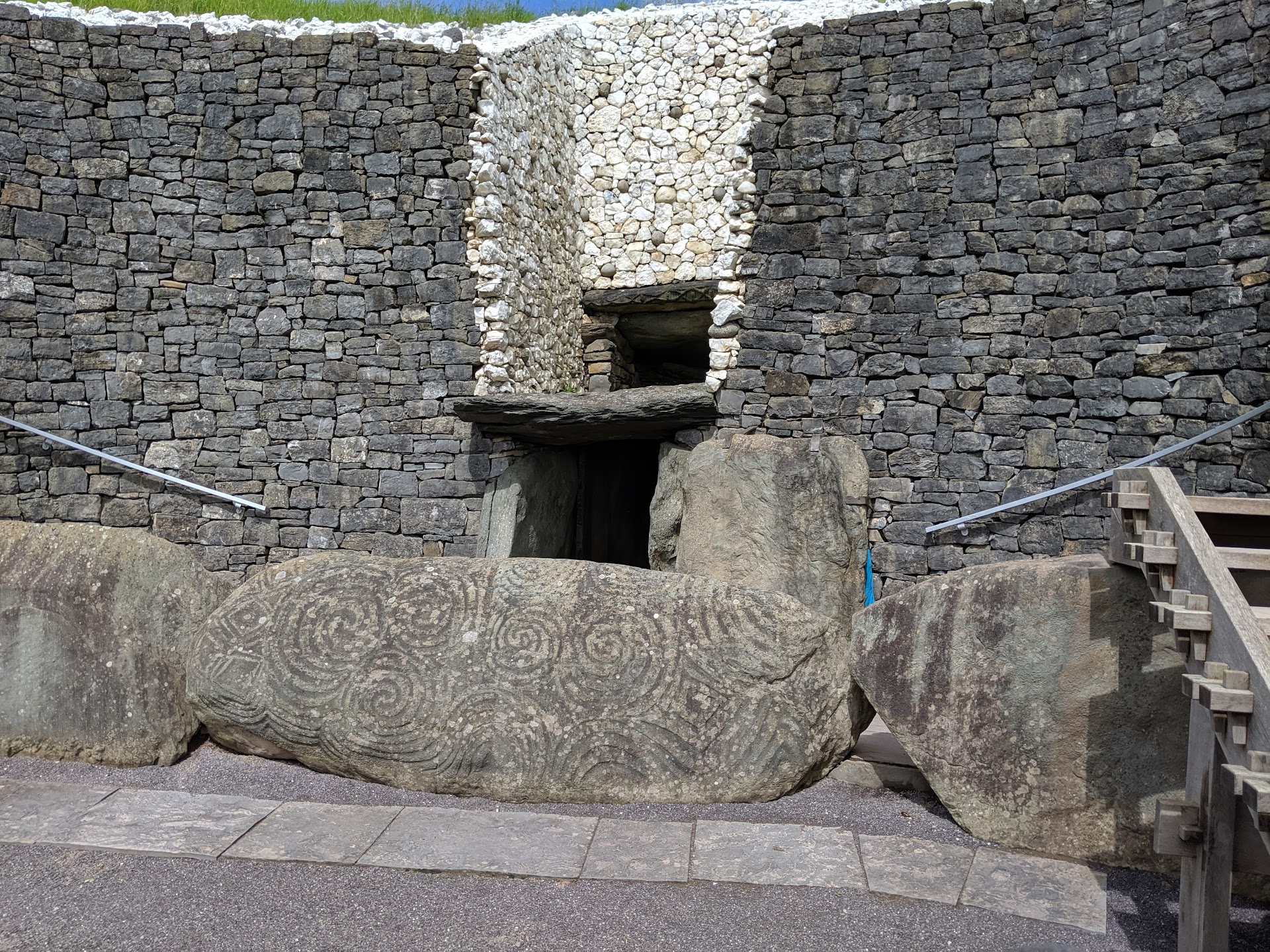 The only advantage to Newgrange is that you can go inside, though they pack about 20 people into the small chamber for their demonstration of the light coming in at the solstice, recreated with a lamp, then rushing everyone out for the next group. It doesn't really give you time to look around and appreciate the tomb. The outside facade is the interpretation of how it might have looked according to the archeologist who excavated the site in the 1970s, and many researchers disagree that it would have looked like this; I could not get an explanation of how the facade is theorized to have been created. The arrangement of the quartz at Knowth is much more compelling, if less spectacular for tourists.