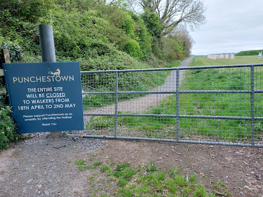 I found a way in...drive into the racecourse.Take the first lest along a gravelled road to the end.There is a metal vehicle gate .Inside are horse jumps to the right and a grey gravel pathstraigjt ahead.About 300m along the path there is a barbed wire fence,then a wooden fence.Both easy to negotiate if you are reasonably nimble.Then a short walk across the field to the stone