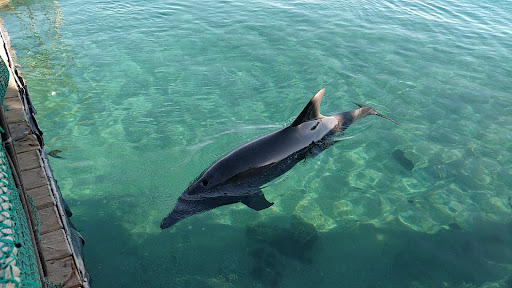 It's of interest to note that the dolphins you'll see here (there are 5 at the time of writing this review) are not restricted to an enclosed area -- they are free to come and go (out to the sea) as they please, but they decide to make their home in this area (and are fed regularly, which I guess contributes to their decision to stay!).