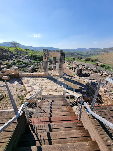יש משטח עץ עם ספסלים ומראה בית הכנסת שמה שבולט בו זה שער מאבן ונוף...