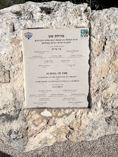 The scroll of fire lays in the middle of a forest of multiple types of trees, called the Forest of the Marthyrs When the sculpture was placed at its location, 6 millions trees were planted all around, one tree for each soul burnt in the camps.