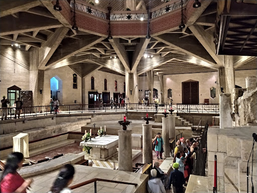 ย ย ย Read moreChurch of the Annunciation. After Sea Of Galilee it was to Nazareth to see Church of the Annunciation. The normal closing time of church was 5:00PM. We got stuck very badly in traffic jam.By the time coach off loaded us at a point beyond which coaches could not go, it was already 5:30 PM and become very dark indeed. We had no hope of seeing the church. Nevertheless walked up to it, a distance of half a kilometre or so. We were greatly and very pleasantly surprised to see that church was still open. Apparently lot of tourist coaches were stuck in traffic jam. News had obviously reached Church authorities who decided to keep it open beyond the usual closing time. The church is built over a place where Christians believed is the cave where Virgin Mary lived and the place where angel Gabriel appeared to her and announced that she would conceive and bear the Son of God, Jesus โ The announcement of angle telling this to Mary is known as Annunciation. The church is an imposing edifice of modernistic design. It was built in 1969. It is topped up by a very high grand cupola almost 179 ft high . A lantern is mounted on top of the cupola. Supposedly showing the light to the world. Impressive white faรงade is etched with reliefs of Virgin Mary and preachers Luke, John, Mathew and Mark. At the extreme top of the triangle is a bronze statue of...