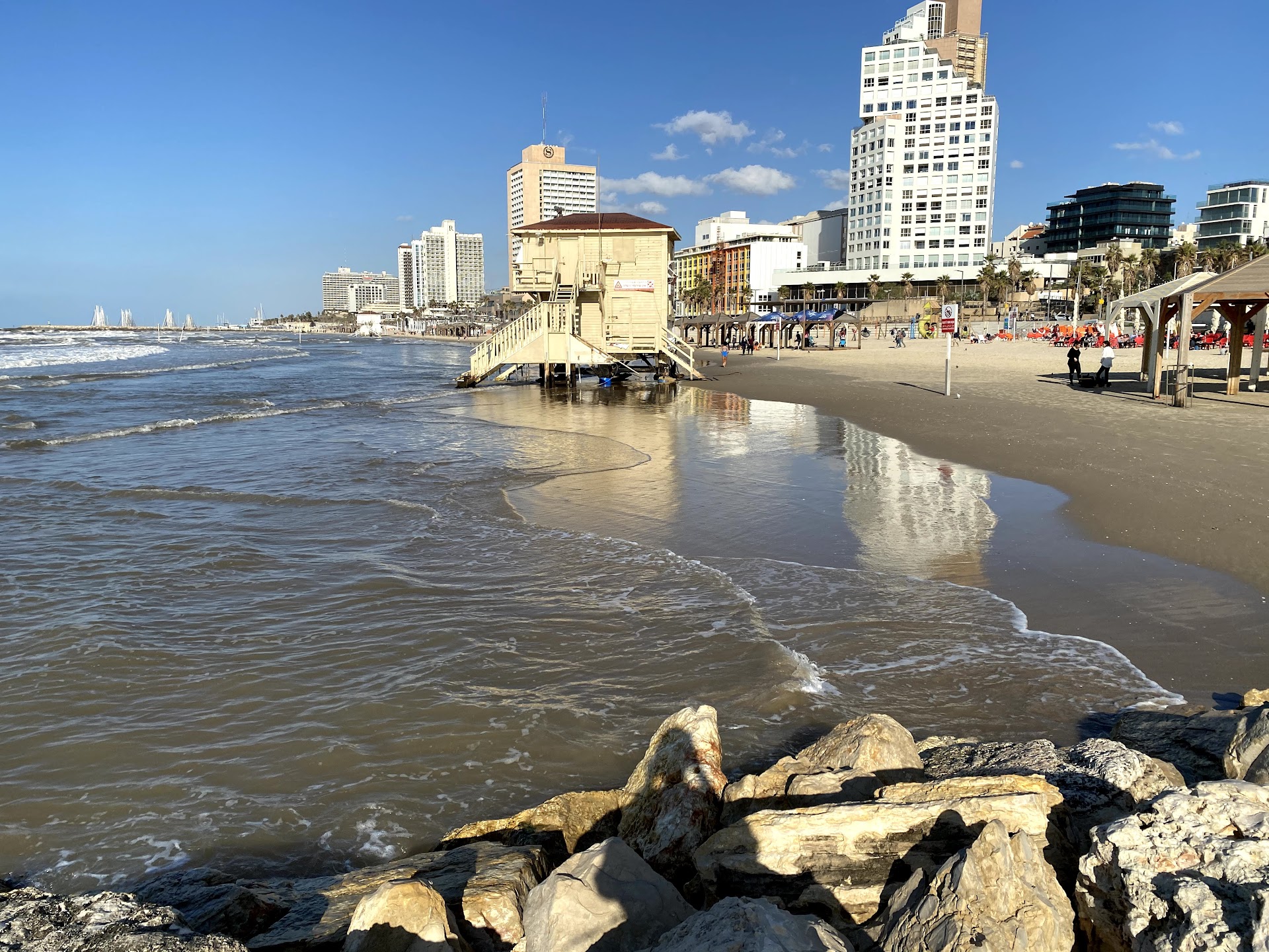 Bograshov Beach is located in the center of the Tel Aviv promenade. It is a regulated and declared beach for bathing, including rescue services and a first aid clinic and an inspection office. The place is very nice and fun especially having marble sheds accessible. The beach is accessible to public transport and is surrounded by paid parking lots. At the beach is the monument to the Altana. The beach was awarded a blue flag to the beaches that meet the highest standards in the fields of environmental education and information, quality of bathing water, environmental management, safety and services. Public services (accessible to people with limited mobility) Dressing rooms Hot showers Coffee shop - Restaurant Sports facilities Children's playgrounds Shades on the beach. Volleyball courts Accessible access to the passage, accessible wardrobes and toilets, accessible shade sheds, accessible drinking facilities, accessible beach showers, chairs accessible to the water line during hours of operation, and a voice guidance system for people with visual impairments. Rental of relaxation chairs and sun beds Free Wi-Fi Blue flag Luggage storage Paid parking. To a map of car parks around the city.