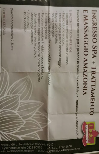 Non è mia abitudine fare recensioni, così negative ma credo sapere ciò che è successo possa essere d'aiuto a qualcuno di voi. Il mio incubo inizia qualche mese fa quando acquisto questo coupon, validità 6 mesi, dopo poco dall'acquisto scatta la seconda chiusura causa covid. Cerco di contattare telefonicamente il centro benessere ma zero risposte idem via mail, per fortuna tramite la pagina Facebook riesco ad ottenere un recapito whatsapp. Una donna, attraverso messaggi sia scritti che vocali, mi dice di non preoccuparmi che essendo la chiusura covid non dovuta né da me né dal centro avrò diritto all'apertura di usufruire del mio coupon, specifico che lavoro fuori regione e che non sarei in zona prima di luglio, lei mi risponde nessun problema. I primi giorni di luglio chiamo per prenotare, loro accettano la prenotazione e mi chiedono di inviare una copia del coupon. Appena dopo l'invio mi arriva un messaggio che mi dice mi spiace il coupon è vecchio e non può essere utilizzato. Ovviamente richiamo inizialmente era irremovibile appena però le ho detto, che avevo tutto Registrato messaggi ecc, ha subito cambiato tono confermando la prenotazione, però solo spa perché quel tipo di massaggio non veniva effettuato più, allora io le dico nessun problema va bene anche un'altra tipologia di massaggio. Ma nulla. Il giorno stabilito mi reco in sede, la prima cosa mi dicono che il massaggio non è più compreso e se voglio devo pagarlo a parte.Io ripeto che essendo presente nel coupon avrebbero dovuto e potuto sostituirlo con un altro massaggio, ma nulla... Andiamo giù, era un percorso per 2 persone... Il percorso era specificato di 2 h e 30 Con kit di benvenuto Ecc ecc allego foto coupon Dalle foto le piscine sembano più grandi La sauna turca puzzava di muffa ( non è la prima sauna che faccio quindi so che quell'odore è anomalo) Del percorso sensoriale con le varie piogge ecc nemmeno l'ombra a stento un inesistente nebulizzatore con luce blu il resto 🤷🏻♀️ Dopo la sauna ci vorrebbe la doccia fredda per stabilizzare il corpo e c è un trita ghiaccio che funziona senza sensore di attivazione quindi ogni persona se vuole utilizzarlo deve prendere lo stesso ghiaccio già usato in precedenza da altri... Il fondo della piscina era scivoloso sinonimo di poca pulizia, in acqua galleggiavano capelli e 2 cerotti. All'ingresso c è la tutela per la privacy, sul silenzio e il non utilizzo dei cellulari... Una coppia di persone adulte non ha fatto altro che farsi foto con tanto flash, ma le adette che giravano hanno fatto finta di nulla. W la privacy...mi si avvicina una delle addette e dopo avermi chiesto il cognome mi da le chiavi degli armadietti, io le dico che deve esserci un errore visto che il percorso sarebbe dovuto durare 2 h e 30 minuti, già non mi avete fatto fare il massaggio adesso mi fate anche finire 30 minuti prima?lei dice che non sa nulla e che ha avuto ordini così ma sarebbe andata a chiedere. Prendo il mio accappatoio e mi diriggo allo spogliatoi, si presenta un'altra ragazza in modo arrogante mi dice che il coupon è vecchio di 2 anni ed è già tanto che ho fatto la spa. Io le ho detto che se vuole ne ho una copia ed anche del giorno dell'acquisto e che erano mesi non anni e che il covid non era stato voluto né da me né da loro. Ma i soldi li avere già presi e spesi, privandomi del massaggio, ecc Che la loro arroganza non è un buon biglietto da visita e che non sono stati loro a fare un piacere a me bensì io a loro a regalare dei soldi per un trattamento non ricevuto. A perdere non sono stata io bensì loro visto che ieri dopo la spa in base a come si sarebbero comportati avrei prenotato per un addio al nubilato 20 donne per la prossima settimana. La ragazza mi guarda e mi dice se vuole può tornare dentro e restare ancora un pó, io di tutta risposta le ho chiesto di lasciarmi fare la doccia perché l'unica cosa che volevo era andar via da quel posto. Stare in commercio non è per tutti, ci vuole cortesia, professionalità e soprattutto evitare queste furbate non vendete fumo perché le persone non...