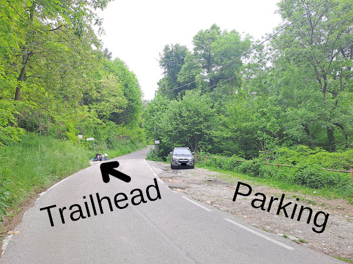 Park on Via Partigiana, coordinates 45.807297, 9.179652 - there's a clearing alongside the road, and another one just inside the forest after the "no parking" sign (see photos).