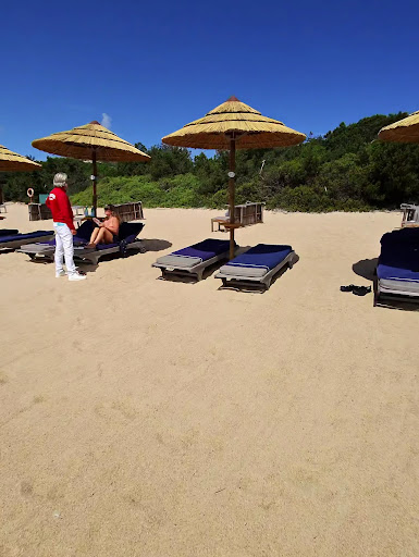 Many quality deck chairs and seating areas for the hotel guest and of course bar drinks for the foolish. Toilets and shower areas at the rear so this is probably the best set up for a day at the beach in the whole of Sardinia with all the comforts.