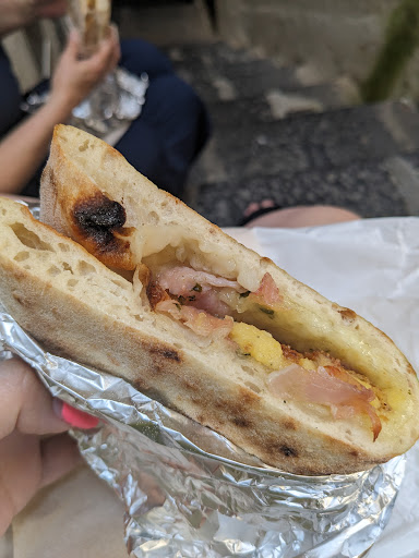 A couple of stand-up tables tucked at the end were filled with Italian teens, and a few people were waiting for orders, so clearly a popular spot. I grabbed two panuozzo to takeaway, filled with mozzarella, sausage and potato. Really tasty and just the sort of thing I wanted for an on...