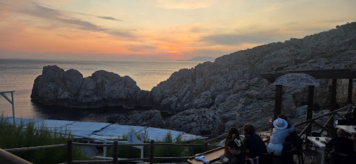 There are a few lounge chairs up top if you're looking for a more comfortable place to relax, but many visitors simply lay towels directly on the sun-warmed rocks to soak up the sun. The vibe is low-key and natural, with the rocky setting offering a unique way to enjoy the sea away from the typical crowded beach scenes.