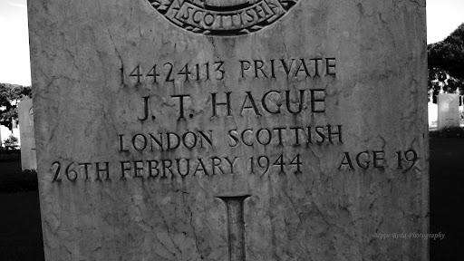 Cimitero Monumentale Britannico, Nettuno, Lazio. Non si può lasciare la costa laziale senza visitare i cimiteri di guerra della Seconda Guerra Mondiale, testimonianze di una tragedia immane che ha provocato oltre 60 milioni di morti. Entrando nel Beach Head War Cemetery, uno dei cimiteri di guerra di Nettuno, è come entrare in uno spaccato di memoria recente e indelebile che ha colpito decine di migliaia di giovani vite cadute in battaglia sul suolo straniero. Colpisce profondamente l'età della moltitudine dei militari caduti, compresa tra i 18 e 19 anni, praticamente dei ragazzi. Chi si sofferma davanti a una di queste croci è facile che sia assalito da un senso di angoscia e di tristezza, pensando alla sua giovane vita spezzata e lo strazio di sua mamma forse impossibilitata a viaggiare per poter piangere sulla tomba del proprio figlio. Ho fatto molte fotografie, ma ne pubblico solo una quasi a caso, poichè rappresenta tutto il dolore e la pietà umana per questi giovani ragazzi. Questa foto l'ho intitolata "Pray for me mamy". Il sito è mistico, immerso nel silenzio marziale come si conviene per un cimitero di guerra e tutte quelle croci, così delineate e defilate sono la testimonianza di quei Comrades In Arms per...