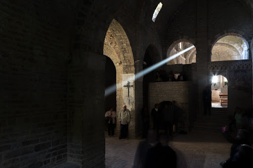 Gisberto e Attone, abate di questa abazia l'uno e di San Vittore alle Chiuse l'altro,"chattano"a proposito di questa abazia.La conversazione si trova su una pergamena datata 1033d.C. Oggi è un'abazia benedettina, ma esisteva già in epoca romana e ancora prima come tempio pagano. Sempre lì, sulla sponda sx dell' Esinante. 1200: i combattimenti con l'Apiro culminano in un incendio che devasta parte della chiesa.Dopo la ricostruzione(seconda metà del XIIsec)il monastero diviene centro di accoglienza, per dare riposo ai giovani pellegrini diretti a Roma, nonché florida azienda agricola. 1442:per decreto papale, unita all'abazia di Val di Castro, gestita dai Camaldolesi. 1810:aboliti gli ordini monastici, la proprietà viene trasferita allo Stato e in seguito venduta ai Doria Panfili, principi romani. 1868:messa in vendita anche da questi, si susseguono nella proprietà tre famiglie locali. Con i Rossi, che amministrano una decina di poderi a mezzadria, l'abazia diventa azienda agricola sotto la guida dei Chiodi, famiglia materna di Enrico Loccioni.Da quest'epoca risalgono gli edifici annessi. 1978:ereditata dal comune di Apiro, attuale proprietario. 1992:restaurata grazie a fondi europei. Inizia l'attività ricettiva e ristorativa. 2017:il comune viene affiancato dalla Loccioni, impresa privata locale, per valorizzare l'intero complesso e la vecchia scuola. ARCHITETTURA-romanica e gotica. Tre absidi, corrispondono a tre navate. Colonnine, monofore, archetti pensili, cornice a dentelli.I4contrafforti a nord sono conseguenza dell'intervento di restauro del 1923. LA FACCIATA-a capanna, stretta tra due costruzioni di stile colonico. IL PORTALE-originario, in pietra bianca, con pilastrino, semicolonne strombate, sul capitello con motivi di foglie e conchiglie si innesta un archivolto liscio. INTERNI-L'ambiente detto AULA è riservato ai fedeli. Il PRESBITERIO era riservato ai monaci, molto sopraelevato e in stile gotico; per la presenza di un muro di rinforzo costituisce una chiesa a sé. LA CRIPTA-Accessibile per mezzo di una scala; ha 5navate ridotte a tre; le navate laterali sono praticabili mediante alcune aperture nelle pareti, concluse da un'absidiola, coperte da crociere sostenute da semicolonnine; il corpo centrale più ampio è tripartito da due file di colonne, bellissimi capitelli con smussi e decorazioni geometriche. Davanti l'abside della navata centrale si eleva un altare del 1140 di forma quadrata nella cui pietra è incisa l'epigrafe che probabilmente si riferisce a un'indulgenza plenaria (remissione di tutti i peccati)indetta in quel periodo. FONTE battesimale?-struttura circolare inclusa nell'antico pavimento,nell'annesso della parte nord. CAPITELLI-addossati alla facciata interna con rappresentazioni di un combattimento tra cavalieri e due animali, al centro un fiore a cinque petali, sopra rombi e cerchi intrecciati. Nel presbiterio capitelli scolpiti a motivi ornamentali, vegetali e animali, del simbolismo cristiano medievale:gallo,balena,leoni,vangeli, vite. AFFRESCHI-Nell'aula dei fedeli, sulla parete dx del tramezzo murario, una Crocefissione. A sx solenne figura di papa in cattedra,S.Urbano IV in trono. La chiave di volta dell'accesso alla cripta è occupato da una Madonna sul trono col bambino. L'EST-Abside e altare stanno ad est,l'Oriente, la direzione vitale con la quale ci si orientava; Gerusalemme,la direzione di Dio. C'era la credenza che chi provenisse da est fosse mandato da Dio, messaggero di Dio, o cmq di buona natura. La luce che si muove da est, l'alba, è simbolo della luce che vince sulle tenebre, la resurrezione di Cristo. LUCE - C'e un occhio circolare, un foro in fondo all'abside, dal quale penetra un raggio di sole che attraversa il buio dell'aula e colpisce un cerchio scolpito nel pilastro della navata laterale sinistra. Avviene il 25 maggio, giorno del patrono, e il 19 luglio. Alle 7.41 va a sovrapporsi sul cerchio. Accade anche nella cripta, dove un raggio entra dalla finestra della navata centrale, e colpisce l'unica colonna con la...