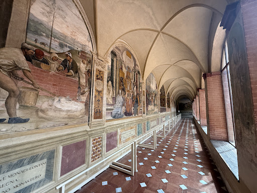 Read moreHo visitato l'Abbazia di Monte Oliveto Maggiore nel mio "programma" cicloturistico delle crete senesi. Ero già stato in questa Abbazia, che non è un museo ma luogo di preghiera e meditazione da parte di monaci benedettini ... gli stessi che trovate nel disbrigo delle mansioni giornaliere, in altre occasioni. Siamo immersi nel verde sopra le Monti di Buonconvento ... sulla strada per Asciano ... tra cipressi e calanchi. Il complesso fu costruito totalmente in mattoni rossi ed ha una vita molto lunga che risale al 1313, quando San Bernardo Tolomei, appartenente a una famiglia nobile e potente di Siena, volle ritirarsi a vita solitaria in questo luogo, proprietà di famiglia, conosciuto come il "Deserto di Accona". Da lì la costruzione del Monastero e, nel 1344, "l'approvazione" ufficiale da parte di Papà Clemente VI. La chiesa oggi la possiamo contemplare in un sobrio Baracco ed è famosa, essenzialmente, per un coro ligneo di notevole pregio. È composto da 125 stalli, di cui 48 intarsiati con mirabile esecuzione, da parte di Giovanni da Verona. L' Abbazia è famosa, tra l'altro, per una serie di affreschi, ben 35, che raccontano la storia di San Benedetto, dipinti da Luca Signorelli e Antonio Bazzi detto il Sodoma, nel Chiostro Grande. Consiglio di "osservare" con attenzione sia la scena di "Come San Benedetto rinsalda lo capistero che era rotto" e di "Come San Benedetto riceve lì due giovinetti romani Mauro e Placido" ... ci sono sorprese per i più attenti. È possibile anche visitare, ma non entrare, il Refettorio. Ho trovato questo luogo particolarmente suggestivo ... i tavoli sono apparecchiati per i monaci in attesa dei pasti quotidiani ... da consumarsi in assoluto silenzio mentre si ascoltano le letture del giorno ... atto che assume una forte valenza spirituale. Laggiù in fondo, dove sta l'Abate, si trova una maestosa tela raffigurante la "Coena Nobili", del pittore Lino Dinetto, del 1948 (l'arte non smette mai di consegnare a noi capolavori). Altro luogo suggestivo è senza dubbio la Biblioteca, costruita in stile rinascimentale a tre navate, conserva i libri provenienti dal Monastero di S. Maria di Monte Morcino Nuovo (purtroppo l'antico fondo libraio, con manoscritti e incunaboli di raro valore, è andato disperso nel 1809 ... aimé). È presente anche un piccolo Museo d'Arte Sacra che...