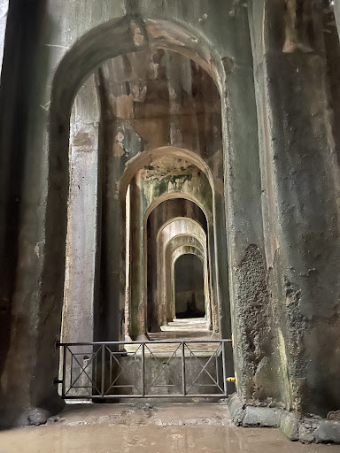 Read moreAllo sguardo di chi entra si presenta un vuoto, profondo come un edificio di tre piani, invaso da una selva di piloni, sui quali poggiano archi e volte. La luce piove dall’alto, prima debolmente poi quando la vista si abitua alla differente luminosità . Quarantotto piloni in tufo a pianta cruciforme dividono lo spazio scavato nel tufo in cinque navate longitudinali e tredici trasversali. Le due navate sui lati lunghi, più esterne, sono coperte da volte a botte longitudinali; sulle altre tre, interne, le volte a botte sono disposte in senso trasversale, con effetto stabilizzante dell’intera struttura. Il piano della navata centrale trasversale è ribassato di circa un metro e mezzo in modo da formare una vasca limaria, per la decantazione e rimozione dei detriti dopo lo svuotamento. L’azione del tempo in più punti ha scarificato le superfici murarie mettendone a vista la consistenza composita in più strati: lo scavo nel banco di tufo, i tufelli squadrati, la griglia dell’opus reticolatum, l’intonaco e il pavimento in signino. Camminando tra i piloni, sotto gli archi e le volte traforate dalla luce si può perdere l’orientamento per qualche attimo e vagare in ogni direzione, sentendosi come trasportati in una dimensione onirica. Le membrature dalle dimensioni grandiose si ripetono ossessivamente, la luce è irreale, i suoni, i rumori, le voci che si riflettono sulle pareti e sulle volte, rivestite degli antichi intonaci impermeabili in cocciopesto, producono echi sordi, modificando continuamente la percezione dello spazio.
