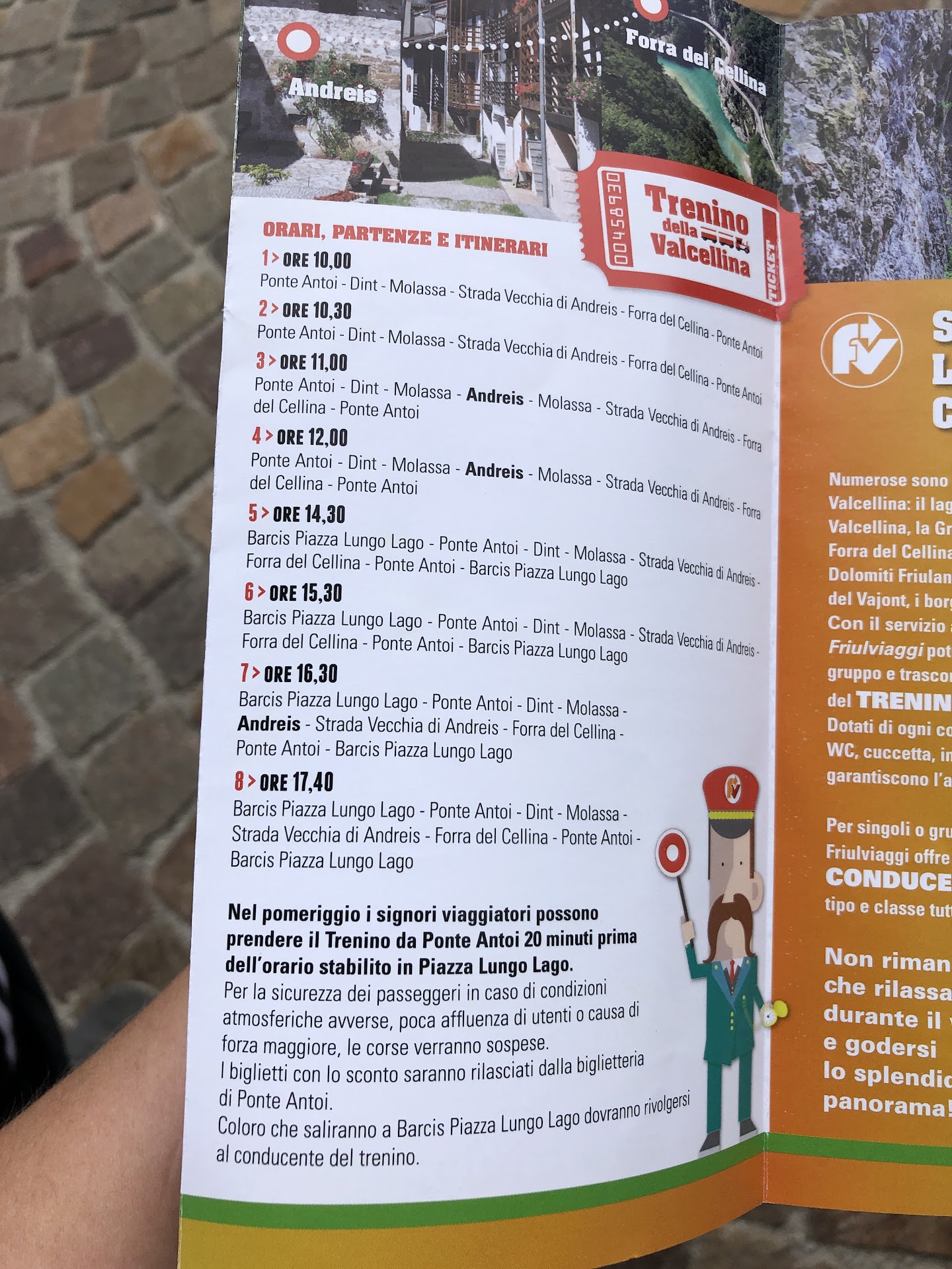 Read moreMah, leggendo le recensioni abbiamo deciso di portare i bambini su questo trenino. Il primo tratto è in mezzo a un bosco (niente di che), poi si arriva ad Andreis, un piccolo paesino, si ritorna indietro e finalmente ci si immette sulla vecchia strada della Valcellina, unico tratto interessante secondo me, ma troppo breve. Le spiegazioni registrate e diffuse dagli speaker sono scarse e ad un volume troppo basso. E poi in piu' tratti si sentiva un forte odore di scarico (magari un motore elettrico sarebbe meglio) Sette euro? Esagerati. Nessuno sconto famiglia...A cui aggiungiamo i sette euro del parcheggio! Perché non è previsto che tu ti possa fermare un paio d'ore ma tutto...