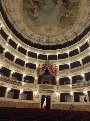 All’interno, il teatro è un vero gioiello 🌟. La sala principale, con la sua forma a ferro di cavallo, è decorata con stucchi dorati, affreschi e velluti rossi che creano un’atmosfera di grande eleganza. La volta è affrescata con scene allegoriche che celebrano le arti, mentre il palcoscenico, dotato di una straordinaria acustica, è stato il palcoscenico di innumerevoli spettacoli di prosa, opera e concerti.