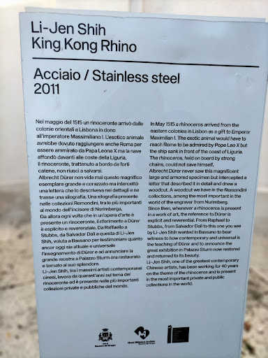 Read moreGraditissimo ritorno a Palazzo Sturm in occasione della mostra "Albrecht Durer - La collezione Remondini". Biglietto intero € 7 per visitare una vera perla di Bassano del Grappa. Il palazzo ospita al pian terreno una sezione dedicata ai Remondini, stampatori tra il XVII ed il XIX sec. Si possono vedere antichi caratteri tipografici, torchi, matrici in legno per la stampa di bellissime carte decorate, libri, colorate immagini sacre, uno splendido planisfero. Particolare una sala dove, aprendo le ante di quelli che un tempo dovevano essere degli armadi forse d'archivio, si trovano incisioni di artisti diversi, tra i quali il Tiepolo. Al piano superiore trova posto il museo della ceramica con l'esposizione di centinaia di pezzi: dai servizi da tavola ai vasi, dai piatti centrotavola a stupendi oggetti da decoro di tutte le dimensioni e di vari stili, fino alla terraglia dell'800. Da vedere il bel mobile donato dal marchese Roi (discendente del Fogazzaro) completato da un intero servizio con tazze e piattini: una meraviglia! Sezione davvero ricchissima completata da due sale particolari: la sala dell'alcova e quella recentemente aperta al pubblico dove si trova il pianoforte. La descrizione non rende la magia di questi ambienti, sono proprio da vedere! Terzo piano dedicato a Durer: 123 xilografie e 91 calcografie raccolte dai Remondini mostrano la bravura ed il genio di questo artista vissuto tra il XV eXVI sec. Le incisioni rappresentano scene sacre ed è esposto anche il famoso "rinoceronte". (Un esemplare in acciaio in scala gigante accoglie i visitatori all'ingresso del museo!) Infine un interessante video mostra le varie tecniche usate per la creazione di questi piccoli capolavori la cui particolareggiata precisione lascia incantati e stupiti. Visitare Palazzo Sturm è stato interessantissimo, probabilmente torneremo per i futuri eventi che saranno in programmazione. Nota di merito al personale, discreto ma attentissimo e...