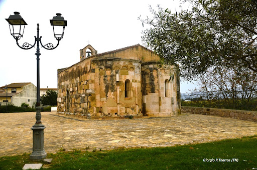 Le prime notizie sulla chiesa di San Platano si riferiscono alla donazione, da parte del giudice Costantino, della Chiesa di S. Ambrogio e delle relative pertinenze ai benedettini dell'Abbazia di S. Vittore di Marsiglia giunti in Sardegna alla metà del XI secolo. La Chiesa viene menzionata come proprietà dei monaci Vittorini nel 1141-1144 ed è circa a questa fase che si riconduce il primo impianto. L'originaria copertura in pietra voltata a botte venne sostituita, a seguito del crollo, da un tetto ligneo a due falde su cui si realizzò il campanile a vela. I rivestimenti in pietra sono stati oggetto d'interventi durante i restauri della metà del novecento. In occasione di questi fu necessario provvedere al ripristino delle fondazioni a seguito di alcuni cedimenti causati da dissesti alluvionali. In tale circostanza i conci vennero smontati e rimontati pezzo per pezzo con alcune riparazioni. L'interno è definito da due navate absidate divise da tre arcate a tutto sesto sostenute da due colonne romane reimpiegate e sormontate da capitello e abaco a tavoletta secondo la norma toscana. Dei capitelli uno è la sezione superiore di un esemplare corinzio a foglie d'acanto, di datazione classica, l'altro, romano, presenta i segni delle lavorazioni eseguite per il nuovo adattamento ma conserva ancora una parte delle decorazioni originali con motivi a foglie d'acqua, ovoli, voluta ionica, pane crociato e rosetta a doppio giro di petali. Nel complesso la struttura mostra un telaio definito da uno zoccolo a scarpa piana, larghe paraste d'angolo e una lesena (pilastro decorativo) per ogni fianco. A circa metà dell'altezza di ogni abside si apre una finestra arcuata (monofora) con strombo gradinato. II registro decorativo è definito dal ritmo di due archetti a doppia ghiera che s'impostano su semicolonne con capitelli classicheggianti. Questi elementi, assieme alla scala esterna sul fianco nord, all'impianto a doppia navata absidata e al pregevole rivestimento della facciata, sono il risultato di un'integrazione provenzale del modello pisano-lucchese. L'utilizzo dei marmi bianco e bardiglio, provenienti dallo spoglio di edifici più antichi, sono un elemento di spicco nella decorazione dell'edificio che richiama il gusto toscano. La gradinata di mensoloni infissi sul lato nord accede al tetto e al campanile a vela che conserva una campana datata al 1428. Sulla facciata due arcatelle pensili, parzialmente conservate, circoscrivono le grandi ruote intarsiate alla maniera pisana, mentre a metà altezza corre un filare di blocchi con incavi che, in origine, contenevano recipienti ceramici utilizzati come decorazione. Nella parte inferiore, inglobato nella muratura, si nota un architrave proveniente dallo spoglio di resti tardoromani che è stato riscolpito, secondo il gusto romanico, al momento del suo reimpiego nell'edificio. Ai lati della facciata si aprono i portali ognuno in asse con due finestre arcuate, di cui resta solo quella a sinistra, i cui archi marmorei sono decorati in bassorilievo da una cornice fiancheggiata da due dischi, uno con quadrupede e uno con croce greca. La chiesa costituisce uno dei più importanti esempi di edificio romanico in Sardegna. Attualmente il monumento è dichiarato bene d'interesse culturale storico-artistico con D.M. n. 88...