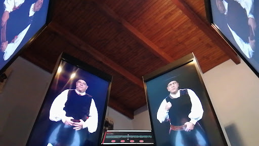 The exhibition has four separate full length video screens showing the actual singers doing their part (see photo for explanation). You stand in the middle listening to them. You can select from over 24 towns to see their styles, including outfits/costumes, and you can select from 2-3 songs for each town.