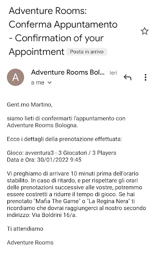 Read morePurtroppo non è stata un'esperienza molto felice. C'era un grave errore nella preparazione della stanza, praticamente abbiamo trovato sin da subito già aperto qualcosa che doveva essere aperto solo a seguito della soluzione di un enigma intermedio. Questo è stato molto confondente e il personale non si è accorto di nulla perché per un problema tecnico non funzionava nemmeno la nostra osservazione con le telecamere. Quando siamo usciti, l'impiegato è stato gentile e si è scusato ma ha risposto qualcosa tipo "Non sono io che mi occupo di questa stanza", come se parlasse a nome proprio e non a nome di un'azienda responsabile del servizio. Gli enigmi non erano male, ma suggerisco agli altri clienti di chiedere esplicitamente conferma che la stanza sia stata preparata correttamente e che le...