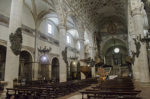 Le due navate laterali, inoltre, sono di larghezza inferiore alla centrale e sono delimitate da una fitta serie di cappelle laterali dedicate a svariati santi, mentre diverse hanno funzione di sepolcro. L'abside, che poggia sopra una cripta ben visibile dalle navate, è fortemente rialzato, tanto che per accedervi è necessario salire per una vera e propria scalinata. Ciò e dovuto al fatto che il progetto della chiesa, molto esteso, avrebbe compreso anche l'occupazione di un vicolo privato proprio nella zona dell'abside. Il proprietario del vicolo, un nobile, a quanto pare non avrebbe dato il permesso di costruirgli sopra e quindi, pur di non modificare il progetto, l'abside fu rialzato e la cripta sottostante accorciata in modo da scavalcare la stradina e permettere il passaggio su di essa attraverso una piccola galleria al di sotto della chiesa. Ciò oggi non è più evidente, visto che il vicolo in questione non esiste più, ma la chiesa possiede ancora la stessa conformazione: abside molto rialzato e cripta sottostante visibilmente più corta...