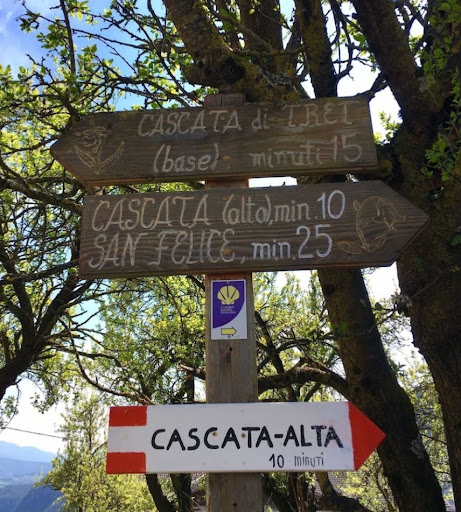 Una volta giunti al paesino di Tret, che è una frazione di Fondo, seguire i cartelli che indicano la cascata. Si arriverà alla fine del paese dove si potrà parcheggiare l'auto nel piccolo spiazzo (non custodito e gratis) difronte alla chiesa, con annesso un piccolo parco giochi attrezzato per bambini. A fianco del parcheggio è presente una fontana in cemento, molto comune in questi borghi, con acqua potabile freschissima dove riempire le bottiglie per la passeggiata. Si prende quindi l'unica strada che esce dal paese verso la campagna, inizialmente asfaltata ma poi sterrata. Inizialmente rimani spiazzato perché per circa un km e mezzo cammini in mezzo alla campagna pianeggiante e ti chiedi dove sarà la cascata, poi la strada comincia lentamente a scendere costeggiando la vegetazione di piante ed arbusti. Procedi spedito fino a quando trovi sulla dx una panca in legno, due metri dopo vedi sul ciglio della strada guardando in basso una scalinata abbastanza ripida che scende in una gola. C'è la presenza di un corrimano in legno, ma essendo gli scalini molto fitti ed alti la discesa risulta molto impegnativa, è assolutamente sconsigliato l'uso del passeggino quindi se avete bambini piccoli che si stancano facilmente consiglio di portarli in spalla con gli opportuni seggiolini da montagna. Altra cosa da segnalare gli scalini sono davvero tanti e a scendere tutti i santi aiutano, al ritorno viene il fiatone......lo dico per le persone anziane, per chi ha particolari patologie respiratorie ed in generale per tutti quelli che vanno allo sbaraglio con le scarpe non adatte alla situazione!!! Terminata la discesa il sentiero si snoda tra una bassa vegetazione di felci ed alti pini, il percorso si fa più mirbido in direzione del fondo della gola per arrivare poi ai piedi della cascata. Ogni tanto ci sono le radici degli alberi in superficie sul sentiero, complice la discesa ed un po' di stanchezza nelle gambe bisogna stare attenti a non inciampare. Arrivati ai piedi della cascata c'è un ponticello in legno dal cui centro si può ammirare il salto d'acqua, uno spettacolo che merita davvero di essere visto per la bellezza in generale della gola e della sua vegetazione. Io ho optato per vedere la cascata dal basso perché ritenevo la discesa più avventurosa e lo spettacolo finale più entusiasmante, ma esiste pure un percorso alternativo (segnato sulle cartine per turisti) per raggiungere la cascata dall'alto ed ammirare il panorama da un'altra angolazione. Nonostante un po' di fatica a risalire la scalinata, è un percorso avventuroso dentro alla gola che merita di essere fatto per ammirare una cascata ed un luogo affascinante e primitivo. Escursione...