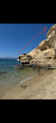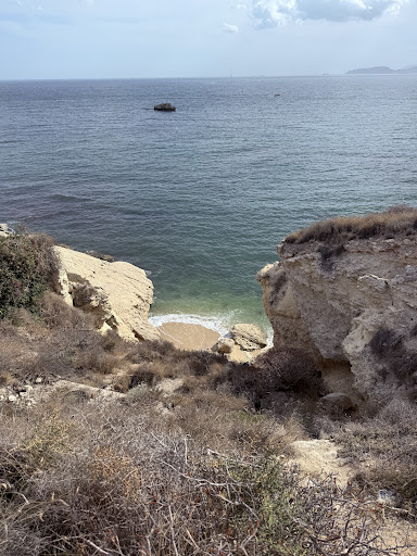 Read moreContrairement à d’autres commentaires je n’ai pas trouvé la plage sale, il n’y avait aucun déchets. J’ai suivi l’itinéraire indiqué par Google maps et il faut s’armer de courage, car vous allez arriver en haut de la falaise. Ensuite en se mettant assis et en y allant doucement on arrive à descendre jusqu’à la moitié de la falaise. Puis vient le pire, le reste de la descente est super raide, et avec aucune visibilité. Étant seule et sans personne pour me guider ou m’aider j’ai trouvé ça effrayant, mais ça reste faisable. Il faut descendre toute la falaise alors qu’on vient de tout en haut (voir photo avec la flèche rouge!!), et le pire, c’est que pour remonter, c’est le même chemin. Pour ma part, je l’ai fait en claquettes pour la descente, et j’ai remonté le tout pieds-nus. Et ne comptez pas accéder par le restaurant d’à côté comme le mentionnent d’autres commentaires, car ils ont installé un gros portail bien fermé et impossible de le contourner pour passer à côté. Arrivée vers 11h, l’endroit est vraiment beau et peu de monde, tout juste une dizaine de personnes. En plein après midi, ça se remplit et on est rapidement collés les uns aux autres. Si vous n’aimez pas marcher sur les cailloux prévoyez des chaussures d’eau car il y’a beaucoup de galets en entrant dans la plage ça fait mal au pied. En revanche sur la plage c’est bien du sable. C’est une belle plage à voir mais soyez prudents et surtout prévoyez de l’eau car en arrivant et en repartant il n’y a absolument aucune possibilité d’acheter à boire car rien du tout autour hormis des...