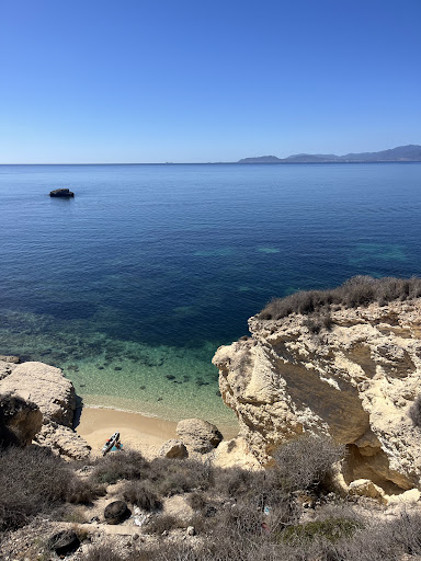 Read moreTout le chemin pour y arriver n'en vaut pas forcément le détour. C'est une crique plus qu'une plage. Le sable est sale et il y a beaucoup de galets. Surtout ne prenez pas le chemin indiqué par Google maps c'est très dangereux vous arriverez au bout d'une mini falaise avec peu de chance de réussir à descendre. Il faut passer par un autre chemin aussi périlleux (ne pas venir avec des enfants, personnes dépendantes de quelqu'un d'autre) en passant par la plage Sant Elia. Il faut longer par la droite le long des rochers donc venir en baskets. Ensuite vous arrivez sur la crique. Il y a vraiment très peu de place donc le côté intimiste se perd si vous y allez et qu'il y a déjà du monde. L'eau n'est claire que sur quelques mètres, il y a des algues etc. Donc à éviter si vous cherchez une plage de sable fin et eau cristalline. La vue est jolie d'au dessus même si le fait d'être installé en dessous des "grottes"...