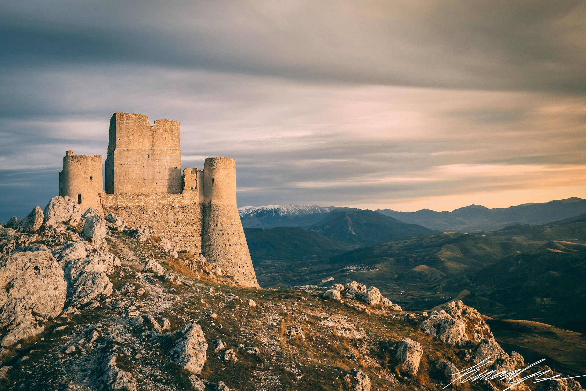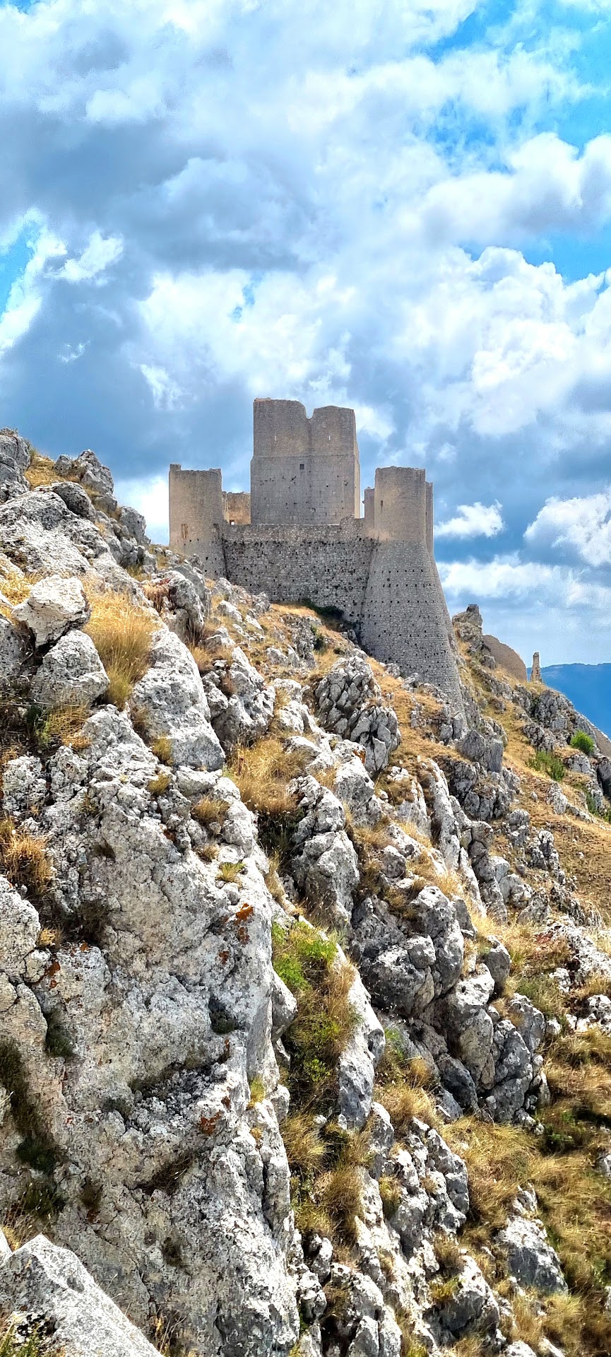 Rocca Calascio is a mountaintop fortress accompanied by Santa Maria della Pieta, a church built in 1596. The fortress was built somewhere around 1140 above the town of Calascio, built around 816, currently half-abandoned due to a terrible earthquake in 2016. There is a restaurant or two still open, and the city below has many places to stop for a coffee, so it isn't too remote of a location.