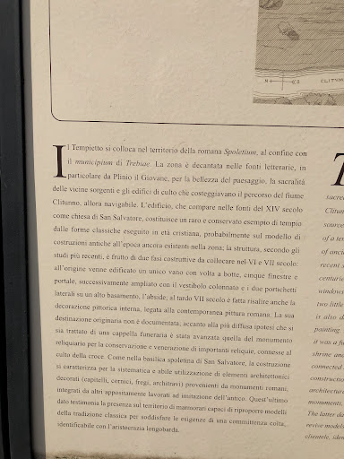 L’edificio è costruito sopra una delle tante sorgenti del fiume Clitunno, già noto nell'antichità per i piccoli sacelli eretti lungo il suo corso nei quali si venerava Giove Clitunno; tale area è ricordata da illustri poeti e scrittori tra i quali Virgilio, Properzio, Plinio il Giovane e Lord Byron.