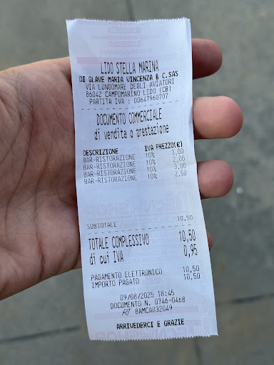 Read moreCi siamo seduti ai tavoli messi a disposizione per i clienti e abbiamo preso al banco (quindi no servizio al tavolo) 1 lattina di estathe, 1 coca cola zero (bottiglia da 450 ml), una lattina di coca-cola e un pacco di patatine in busta (quelle piccole da 50g), alla modica cifra di 10,50€ (lattina di the 3€, lattina di coca cola 2,50€, bottiglietta di Coca-Cola 3€, patatine in busta 2€). Capisco bene i rincari dovuti all’inflazione, ma non siamo nemmeno a Porto Cervo. Siamo a Campomarino Lido, provincia di Campobasso, in Molise! La proprietaria, inoltre, non spicca per simpatia e apertura al pubblico (molto male dato che è la prima skill che una persona che lavora nel pubblico dovrebbe avere). Anche restia al pagamento con carta (non carina la battuta che mi ha riservato quando ho dichiarato di voler pagare con carta). Il lido si salva per il gelato,...