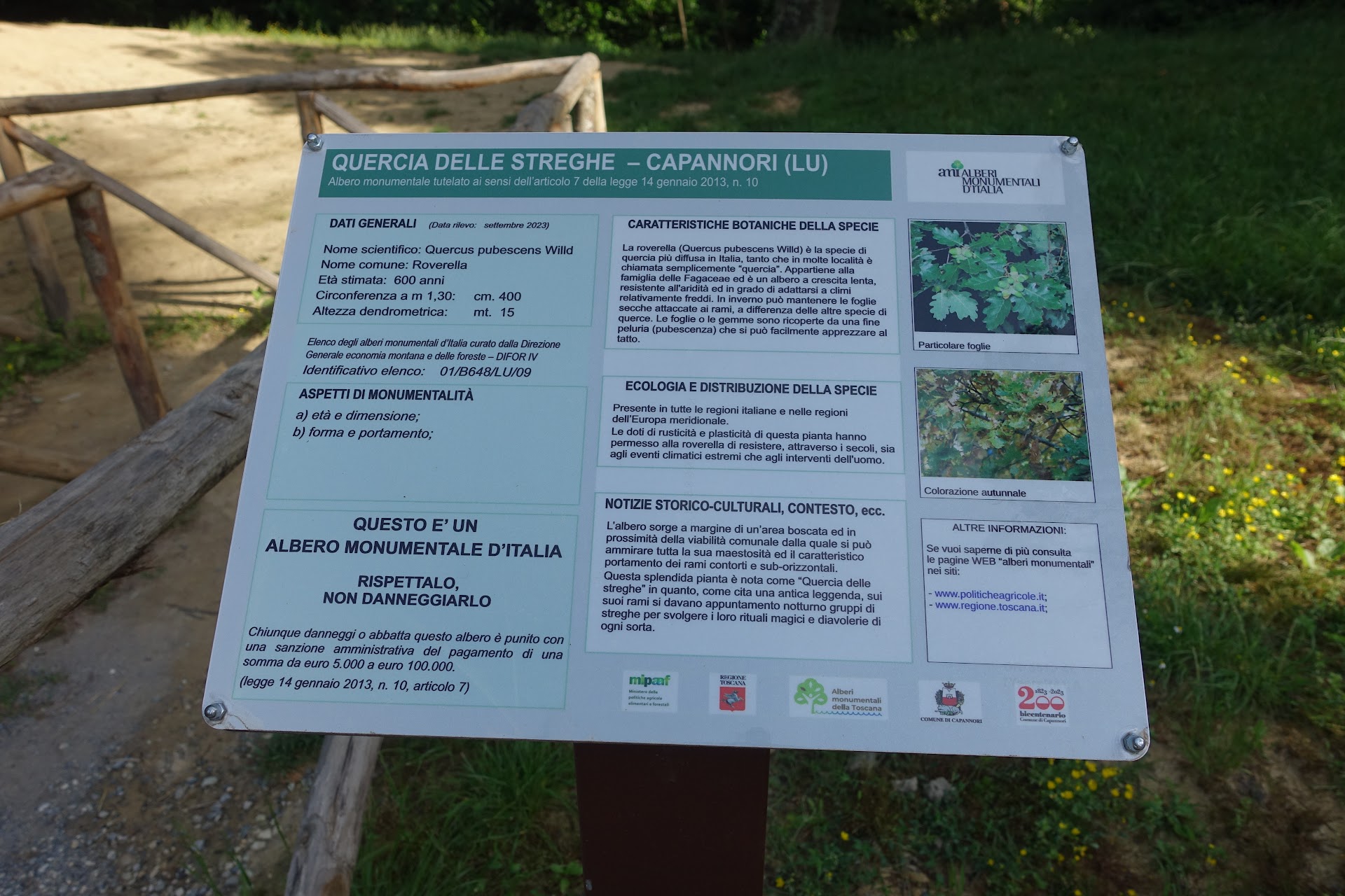 Il Quercione, meglio conosciuto come Quercia delle Streghe, ma anche come Quercia di Pinocchio o Quercione del Carrara, si trova a Gragnano, in località San Martino in Colle, nel Parco di Villa Carrara, nel Comune di Capannori, a Lucca. Si raggiunge tramite una strada bianca, tra l'altro ben tenuta, sia salendo da Gragnano, una volta lasciata la "Pesciatina", che scendendo da Montecarlo ... di Lucca. E' una Quercia della comune specie della Rovanella (in "parlato colto" ... Quercus Pubescens) di ... appena 600 anni, probabilmente nata intorno al 1400. Ha una altezza di circa 15 metri (altre fonti parlano di circa 24 metri); un tronco dalla circonferenza di 4 metri e una chioma di circa 40 metri di diametro che la collocano tra le più grandi in Toscana (ho trovato che è seconda ma non dove è la più grande ... mah). E' stato dichiarato "Albero Monumentale d'Italia e, sembra (non ho nessun riscontro certo), sia segnato nelle mappe Nato. Questa pianta ha però una particolarità che la distingue da tutte le altre ... i suoi rami, enormi, si sviluppano paralleli al terreno, cosa non comune, appunto, in questa specie. Oggi il Quercione gode di buona salute, nonostante l'affluenza di turisti abbia comportato il danneggiamento delle radici a causa del continuo calpestio, favorendo l'attacco di insetti infestanti che, con il tempo, hanno colpito anche il tronco. Nel passato, invece, ha rischiato di diventare legna da ardere quando, era la 2a Guerra Mondiale, le truppe tedesche lo "misero nel mirino" proprio per questo scopo. Il progetto "sfumo" grazie alla mobilitazione degli abitanti di San Martino in Colle. Poi, erano gli anni 60 del '900, un fulmine lo colpi provocando danni importanti. Infine, alla fine del '900 alcuni vandali hanno spezzato alcuni rami per ... sederci sopra. Sempre il Quercione "gode" di leggende suggestive che lo rendono ancor più interessante. Il primo è legato ad uno dei suoi Alias, Quercia delle Streghe appunto. Si narra che qui, sui tronchi della pianta, si radunava un gruppo di Streghe per i loro Sabba e che questo ne ha causato l'insolito sviluppo dei rami. Un secondo è legato all'assedio di Firenze del 1325 alla Rocca del Cerruglio. Lì un manipolo di soldati lucchesi, asserragliati nella Rocca, riuscì a respingere gli assalitori permettendo così a Lucca di continuare ad essere Città libera. Questo grazie a riti sabbatici sotto la Grande Quercia, così narra la leggenda, invocati dal Condottiero Castruccio Castracani. La terza legenda (ed è forse la più reale) è legata a Pinocchio. Narra che qui, proprio al Quercione, Carlo Lorenzini, meglio conosciuto con il nome d'arte Carlo Collodi, colloca la scena narrata nel 15 capitolo del suo libro capolavoro, "Le Avventure di Pinocchio", quando i due briganti, il Gatto e la Volpe, impiccano il povero Pinocchio ad un ramo della Quercia (da lì il Quercione di Pinocchio). Narra il capitolo: "... detto fatto gli legarono le mani dietro le spalle e passandogli un nodo scorsoio intorno alla gola lo attaccarono penzoloni al ramo di una grossa pianta detta la Quercia Grande ...". Poi Pinocchio fu salvato da Can-Barbone, inviato dalla Fata Turchina. Da dire che Carlo passò l'infanzia a casa dei nonni a pochi Km da qui ......