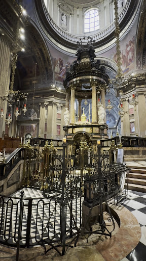 Il tempio appare, in verità, diviso in due corpi separati: quello occidentale, più vasto, ospita quattro cappelle riccamente decorate per lato, le cantorie e l'ingresso principale; quello orientale, di dimensioni minori, consente la discesa alla cripta. Le due parti sono separate dal maestoso altare maggiore.