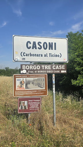 Borgo tre case ..IL Ragazzo di campagna strada Canarazzo Carbonara al Ticino provincia di Pavia . Qui molti turisti ogni fine settimana vengono a visitare questo luogo dove nel 1984 venne girato il film con Renato Pozzetto , appena arrivati un cartello turistico messo sull'argine del Ticino ti invita su quello che fu il set ..la Cascina Casoni un luogo avvolto dal verde nel silenzio più assoluto . Siamo nella frazione di Borgo 10 Case .IL paese immaginario che faceva da sfondo alle vicende di Artemio il contadino dalle battute diventate un cult . Qui percorriamo il percorso della strada di Canarazzo poco fuori Pavia , ma ci accorgiamo che la ferrovia che si vedeva nel film non c'e" piu e neanche le trattorie e i campanili insomma volendo dire nell'immaginario qui si vedevano passare i treni che gli anziani del paese si sedevano a guardare , appena fuori dal borgo riconosciamo i campi di Artemio e Maria Rosa e la lingua di terra battuta che la madre del contadino scendeva in tutta fretta per andare a rispondere alla telefonata del figlio andato a Milano in cerca di fortuna . Incaminandoci ci accorgiamo che dove si vedeva la casa di Artemio e qui siamo.in piena Lomellina invece c'e" il Molino d'Isella , dentro la frazione di Gambolo" , non facile da trovare perche" nascosta nella Valle...
