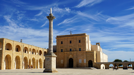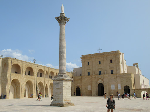 La basílica de Santa Maria di Leuca es el gran símbolo de este lugar. Esta iglesia es también llamada como Santa Maria de "finibus terrae", es decir el fin de la tierra conocida. La iglesia se encuentra en un lateral de una gran explanada asentada en un imponente promontorio rocoso con unas increíbles vistas sobre el mar. Sobre esta explanada, en cuyo centro se ubica una columna mariana coronada por una escultura de la Virgen, se abre una plaza semicerrada por un lateral con una columnata de arcos de medio punto. Al otro lado de la explanada se levanta el imponente faro del cabo de Santa Maria di Leuca, el segundo más alto de Europa. En este mismo lugar hubo en época de la República Romana un templo dedicado a la diosa Minerva. Siglos después, durante los primeros años del cristianismo, el templo pagano fue transformado en una iglesia cristiana. Sobre este hecho, existe una leyenda que cuenta que San Pedro pasó por este lugar al llegar a las costas de la península Itálica en su viaje desde Jerusalén a Roma, llegando a convertir a numerosas personas, lo que provocó la construcción de la primera iglesia cristiana en este lugar. Esta primera iglesia sería destruida y reconstruida hasta en seis ocasiones a lo largo de los siglos, con la persecución de Diocleciano a comienzos del siglo IV, las invasiones normandas del siglo XI o las incursiones de los sarracenos otomanos a lo largo de los siglos XVI y XVII. La iglesia actual fue erigida definitivamente hacia el año 1720. La fachada principal está construida en piedra leccese y presenta un aspecto muy sobrio y sencillo a modo de fortificación, conformado en dos cuerpos. El cuerpo inferior carece de adornos, con un gran portón que se abre en el centro, cerrado por dos puertas de bronce realizadas en el año 2000 a raíz del Jubileo. El portón, con un arco de medio punto sobre el que está esculpido el escudo pontificio, está flanqueado por cuatro columnas simples. En el cuerpo superior se abren varias ventanas y cuatro columnas simples con capiteles jónicos, así como las figuras de dos ángeles guardianes, y todo el conjunto coronado por una cruz de hierro. El interior de la iglesia presenta planta de cruz latina con una decoración plenamente barroca. Destaca, especialmente, el altar mayor de mármol blanco en el ábside, con una pintura de la Virgen con el niño del siglo XVI, que se salvó de forma milagrosa de un voraz incendio. También es de reseñar el púlpito barroco hecho en piedra leccese con bajorrelieves que hacen referencia a diferentes milagros de San Pedro. La basílica de Santa Maria tiene una gran importancia para los fieles ya que desde aquí comienza un camino de peregrinación hasta Roma a través de dos antiguas calzadas romanas, la vía Traiana y la vía Appia. La explanada se asienta sobre un promontorio rocoso en el que se adentra en el mar la punta Meliso. Precisamente en este cabo se unen las aguas del mar Adriático con el mar Jónico y aunque no se llega a apreciar con mucha claridad, se llega a distinguir la diferencia entre las corrientes de los dos mares formando una raya entre ambos. Desde la explanada hay varios miradores desde donde se tienen unas excelentes vistas de los dos mares. Hacia el este y en los días muy claros se puede llegar a divisar las costas de Albania y la isla griega de Corfú, mientras que por el oeste se tienen unas preciosas vistas del puerto de la ciudad. Hay un pequeño parking gratuito junto al faro. También, se puede llegar andando desde el puerto de la ciudad a través de una escalera monumental dividida en dos tramos de casi 300 escalones cada uno, separados por una cascada artificial. Aunque cuando nosotros estuvimos la cascada no tenía agua. Merece la pena una visita a esta iglesia y sus alrededores con una naturaleza desbordante y con unas magníficas vistas de los dos mares, especialmente al atardecer con unas puestas de sol...