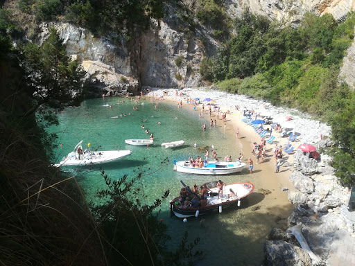 Vraiment scandaleux, comment on peut laisser faire ça ? En arriver là ? Qui s’occupe de la protection de la nature en Italie ?! Nous sommes en présence d’un exemple parfait de petit bijou complètement enlaidit, malgré sa difficulté d’accès : Plusieurs cabanes construites (Bar, 2 terrasses avec tables/chaises/bain de soleil, rangement, WC …) Privatisation de la meilleure partie de la plage (Où sont les autorisations pour faire ça ?! C’est monnaie courante en Italie de s’octroyer 90% de la plage de manière privative et laisser 10% -souvent les parties les plus moches- au public.) La loi du littoral ?! Rangées de parasols avec leurs chaises sur la plage déjà petite. Musique Fil électrique qui descend la sublime falaise. (Et oui, il faut bien alimenter en électricité la musique, les frigos, les lumières etc.) Filet de protection contre les chutes de pierre mit pour éviter qu’un touriste, contribuant à cette ineptie, se prenne une pierre sur la tête pendant qu’il sirote son coca-cola sur la terrasse Nord. Des dizaines de bateaux à essence, nous rappellent, grâce à leur fumée, que nous sommes tjrs en 2018 à utiliser ces sublimes énergies fossiles. Ces bateaux déversent un amas de touristes, qui font de cette plage tout sauf un endroit de bon sommeil !