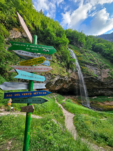 We parked at Trattoria al Fontanone – the sign said 2€ for parking, but there was no one around, so it was free. 😄 From the lot, you can already spot the waterfall in the distance. The trail is short and sweet: