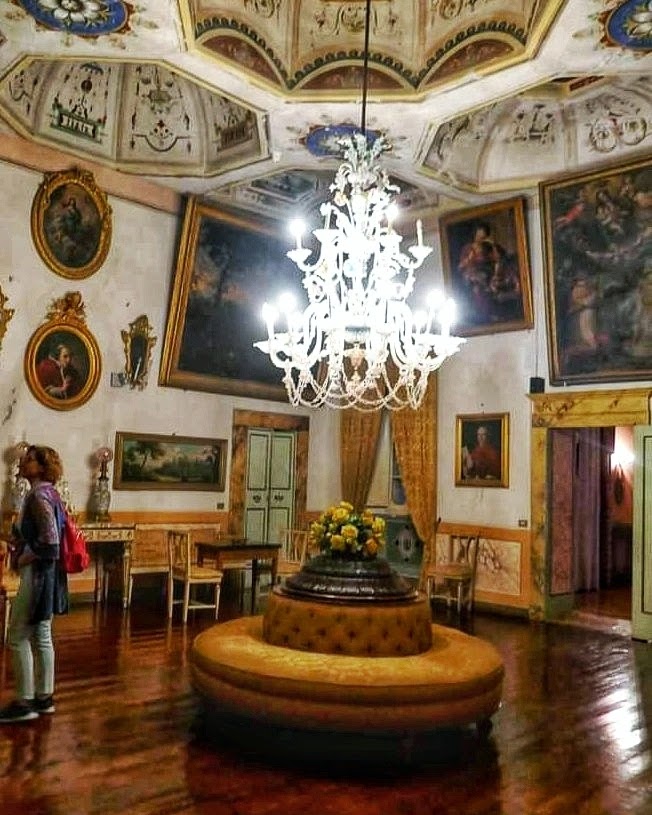 Il Salone della musica a Palazzo Castiglioni di Cingoli. Nel cuore della casa museo, dove visse Francesco Saverio Castiglioni divenuto papa col nome di Pio VIII, la stanza più sontuosa è questo salone, con al centro un divano circolare e un bellissimo lampadario di vetro dipinto. Il controsoffitto, interamente dipinto con scene mitologiche e allegoriche, contiene 9 piccole cupole, 5 ottagonali e 4 pentagonali. Il loro scopo è quello di migliorare l'acustica dell'ambiente. A piano terra del palazzo è conservata la cucina arredata con suppellettili d'epoca e la stanza del ristorante La Cantina del Palazzo, con ingresso sia dalle mura che da Via Benedetto da Cingoli, oggi però...